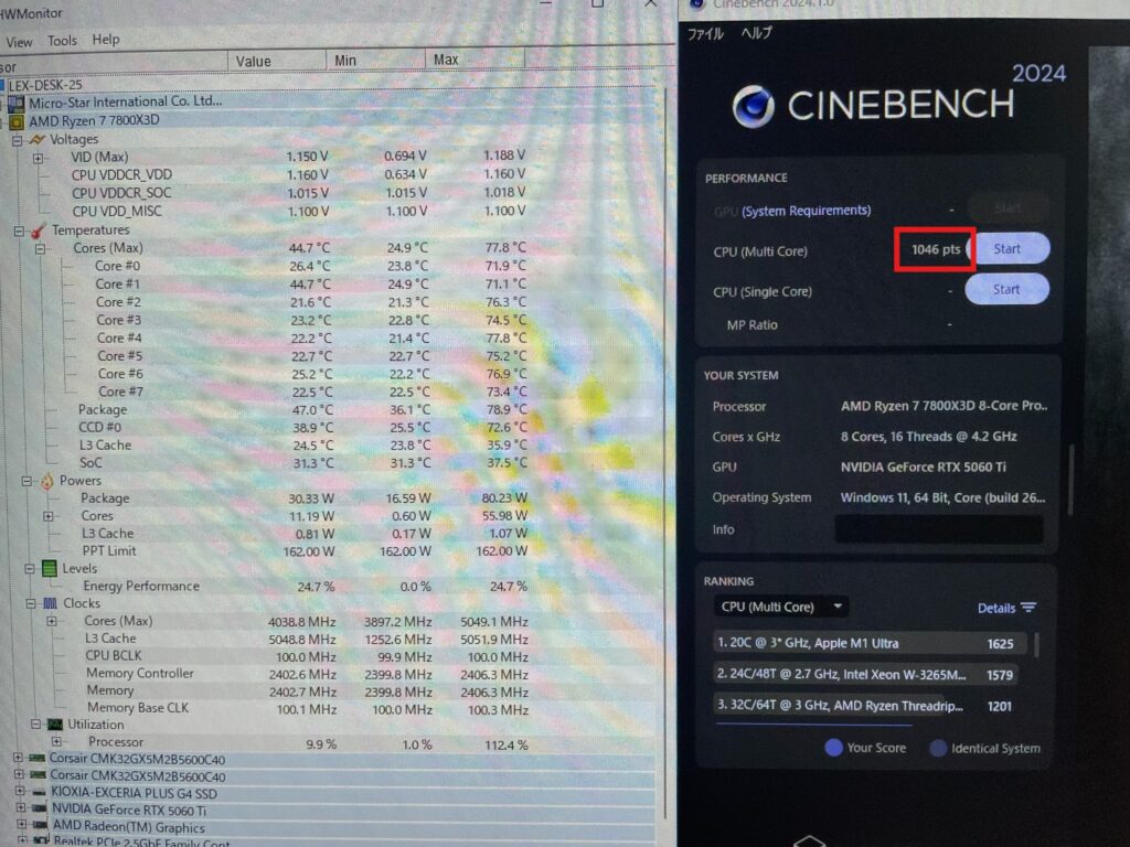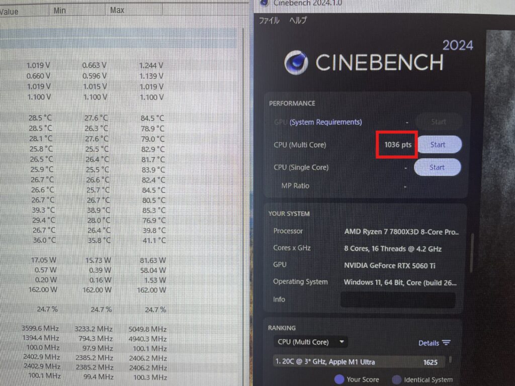ベンチマークソフト「CINEBENCH 2024」。こいつで計測した俺のCPU(Ryzen 7 7800X3D)のスコアは「1036 pts」。決して悪い数字じゃない。でも、SNSやレビューサイトを漁ると、同じCPUを使っている猛者たちが「1040超えたわ」「1050いった」なんて報告を上げているのが目に入る。